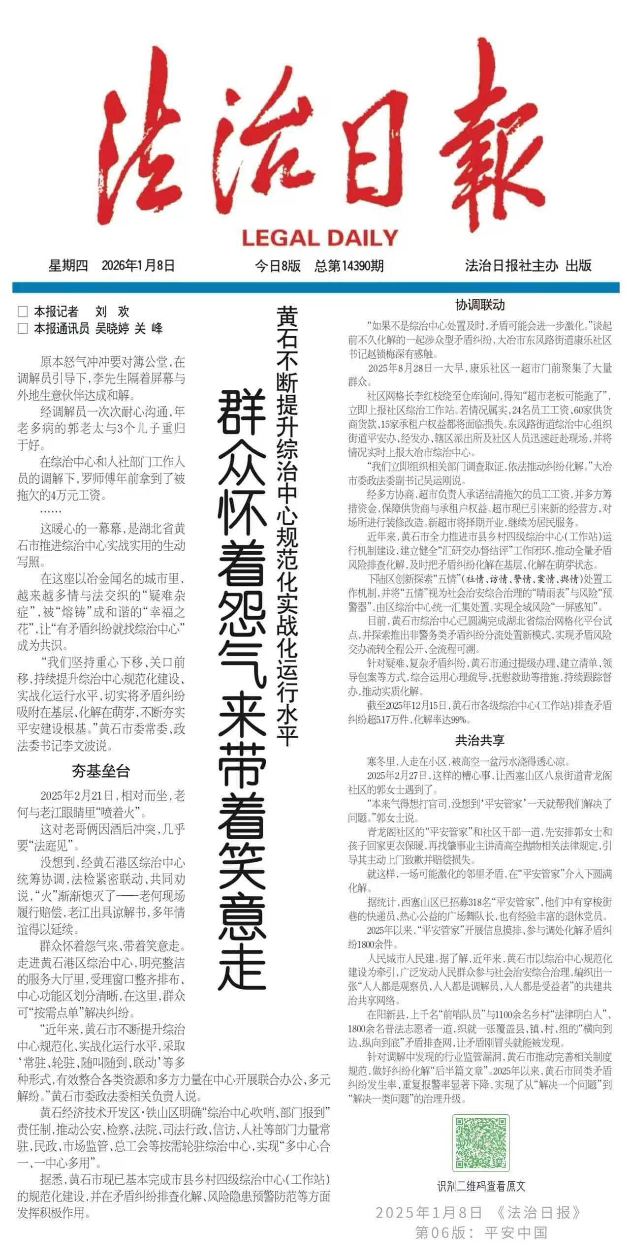 《法治日报》报道:黄石不断提升综治中心规范化实战化运行水平 群众怀着怨气来带着笑意走