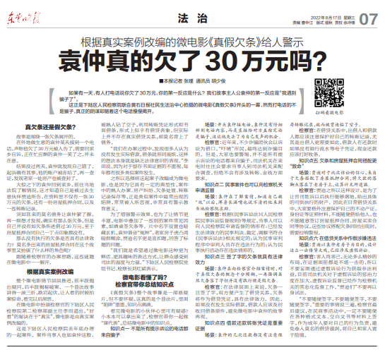 《东楚晚报》刊登:根据真实案例改编的微电影《真假欠条》给人警示 袁仲真的欠了30万元吗?