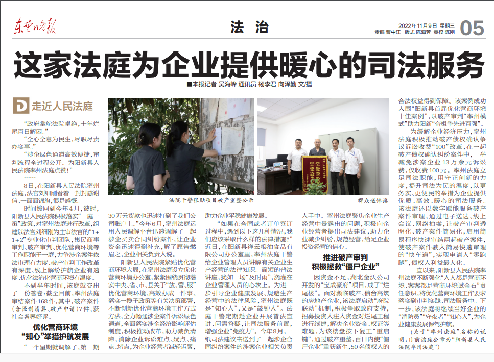 《东楚晚报》刊登:这家法庭为企业提供暖心的司法服务