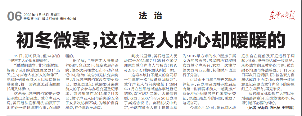 这两天,房产的档案变更登记手续已全部完成。兰守声老人说,黄石港法庭和胡法官解开了困扰她一桩15年的心事,心里暖暖的。