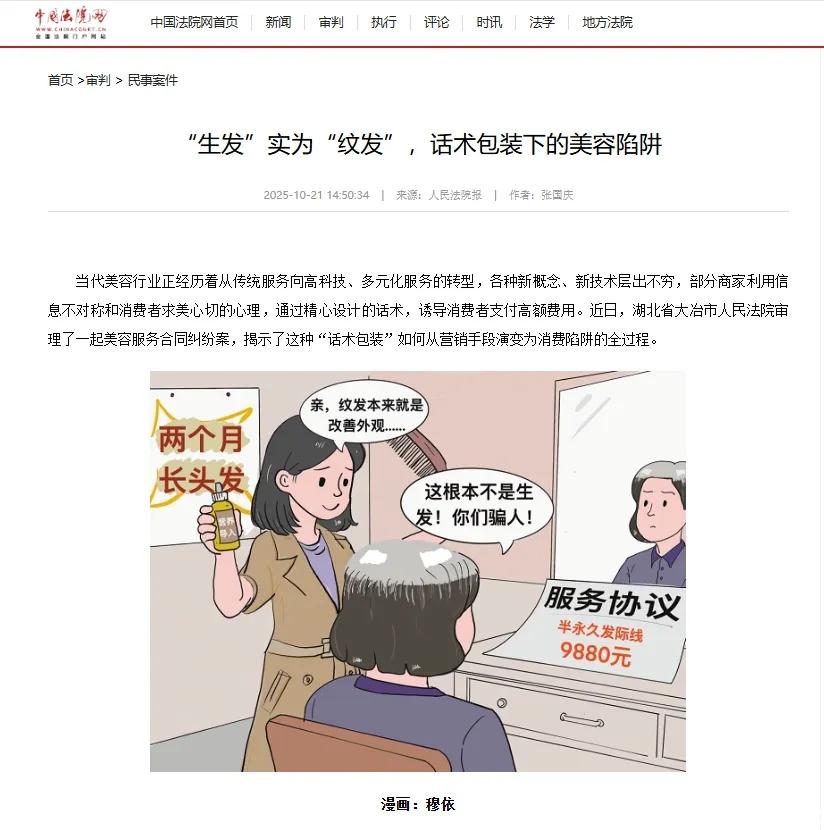 “我只是想要真正的头发,他们却给我画了一个假发际线。”在法庭上,李某哽咽着陈述道,“如果知道只是纹绣,我根本不会花这么多钱。那些照片肯定是假的,他们从头到尾都在骗我。”她的愤怒中夹杂着无助——作为普通消费者,她难以分辨美容宣传中的真伪,而近万元的损失对工薪阶层的她来说不是小数目。