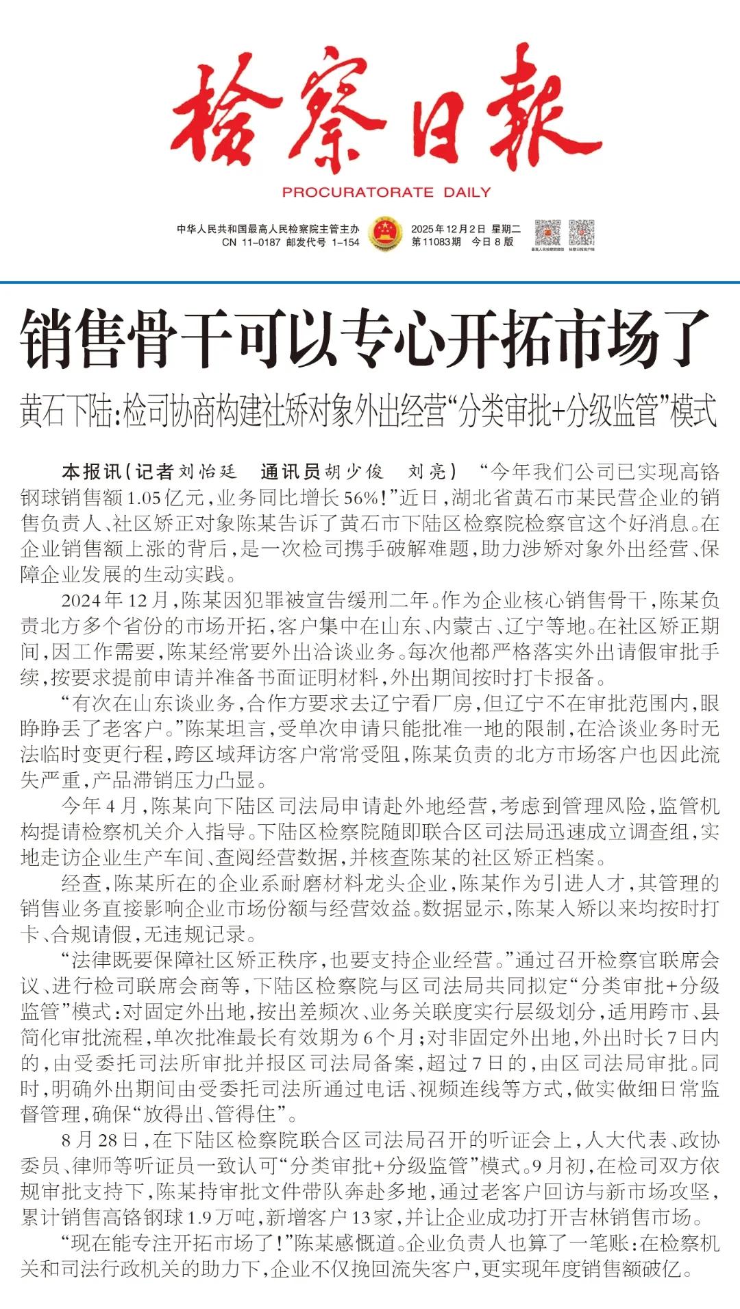 “今年我们公司已实现高铬钢球销售额1.05亿元,业务同比增长56%!”近日,湖北省黄石市某民营企业的销售负责人、社区矫正对象陈某告诉了黄石市下陆区检察院检察官这个好消息。在企业销售额上涨的背后,是一次检司携手破解难题,助力涉矫对象外出经营、保障企业发展的生动实践。