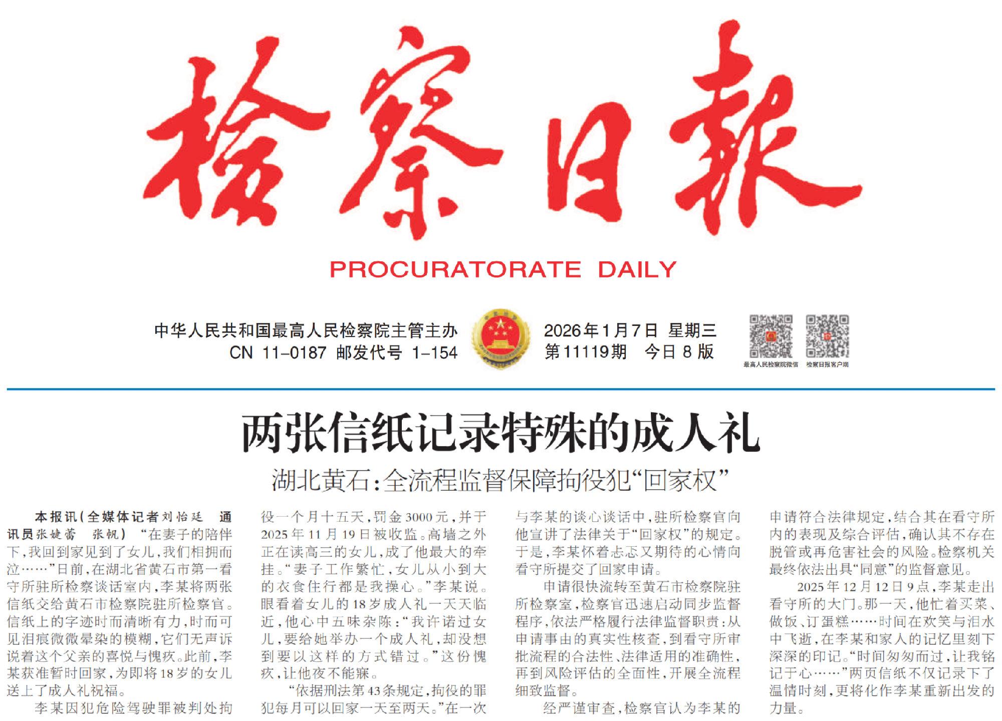 “在妻子的陪伴下,我回到家见到了女儿,我们相拥而泣……”日前,在湖北省黄石市第一看守所驻所检察谈话室内,李某将两张信纸交给黄石市检察院驻所检察官。信纸上的字迹时而清晰有力,时而可见泪痕微微晕染的模糊,它们无声诉说着这个父亲的喜悦与愧疚。此前,李某获准暂时回家,为即将18岁的女儿送上了成人礼祝福。