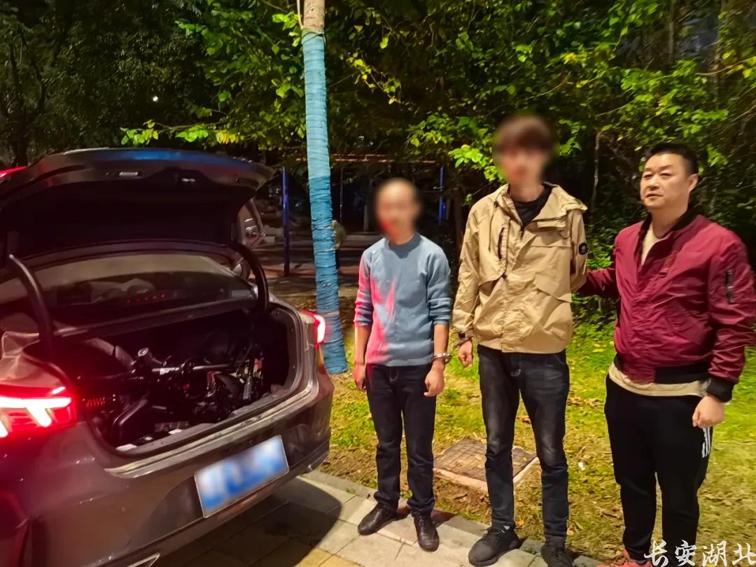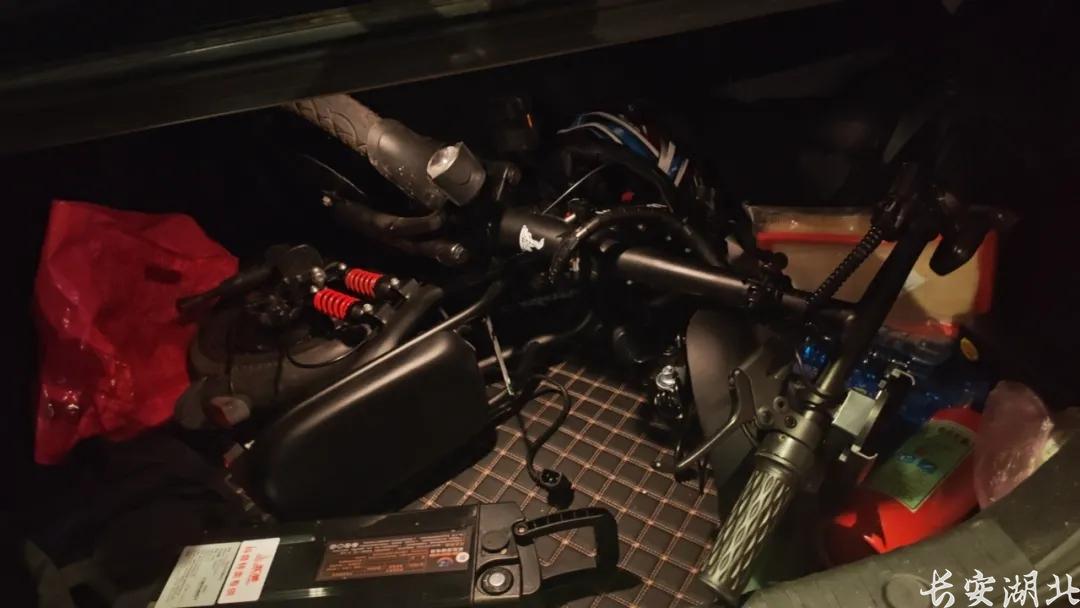 ▲电诈嫌疑人放在轿车后备厢内的折叠电动车