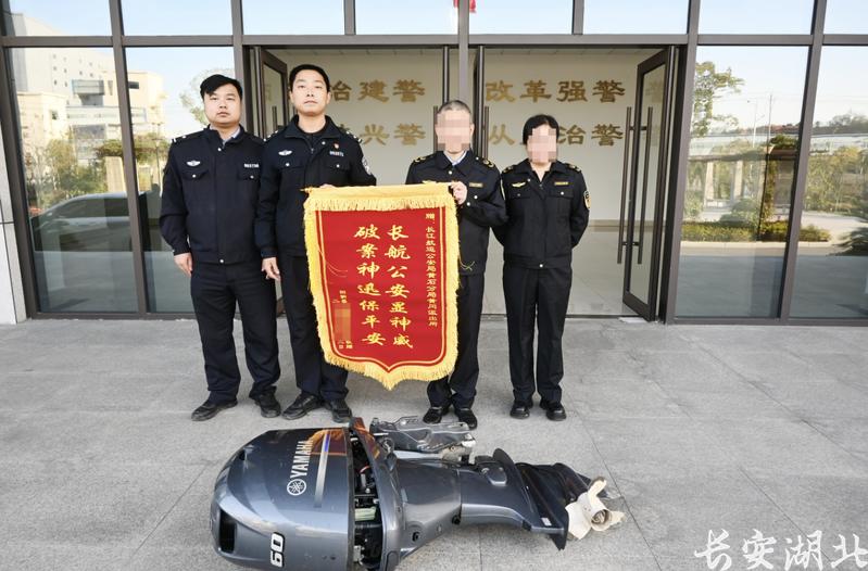 11月26日下午,长航公安黄石分局黄冈派出所将追回的被盗执法艇发动机发还给受害单位。为表达谢意,该单位工作人员将印有“长航公安显神威,破案神速保平安”字样的锦旗递至民警手中。