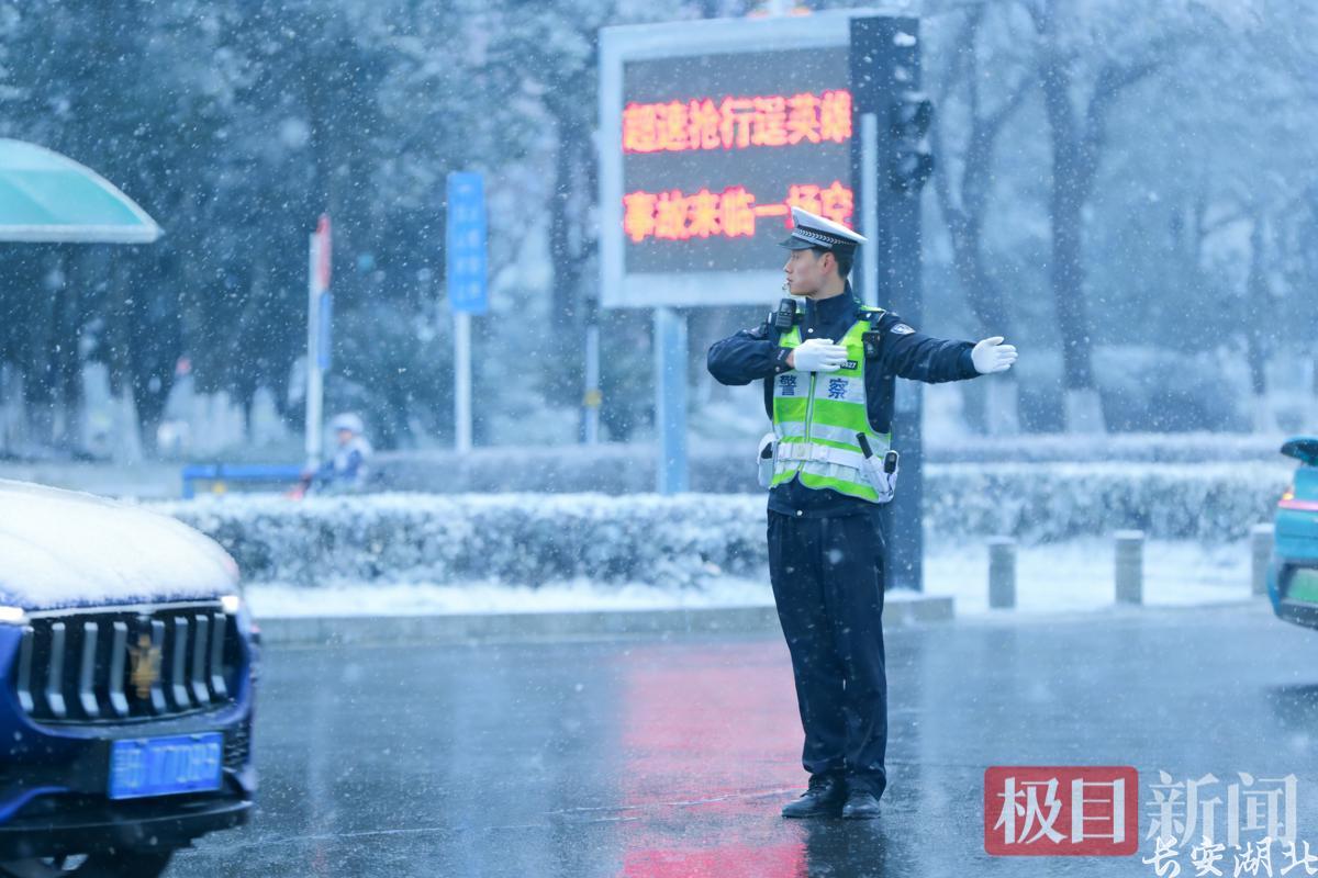 黄石市公安局交通管理支队民警在雪中指挥交通疏堵保畅 秦浩 摄