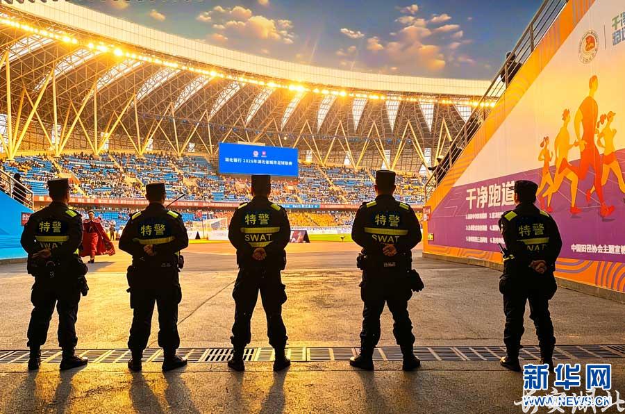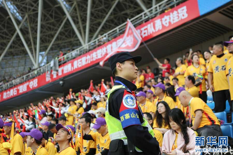图为4月12日晚,黄石公安守护“楚超”赛场内外平安有序。新华网发 胡喆 摄